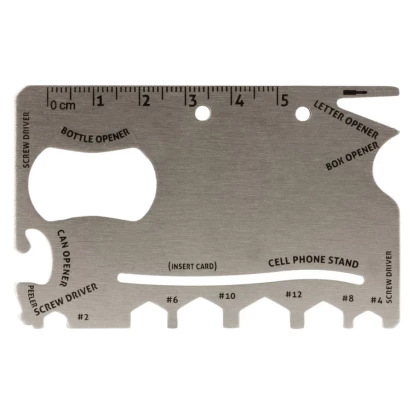 Narzędzie wielofunkcyjne w etui, 9 funkcji: linijka, mini wkrętak, otwieracz do kartonu, 2x wkrętak, klucze płaskie (#2, #4, #6, #8, #10, #12), podstawka pod telefon (karta nie jest dołączona), otwieracz do puszek, otwieracz do butelek