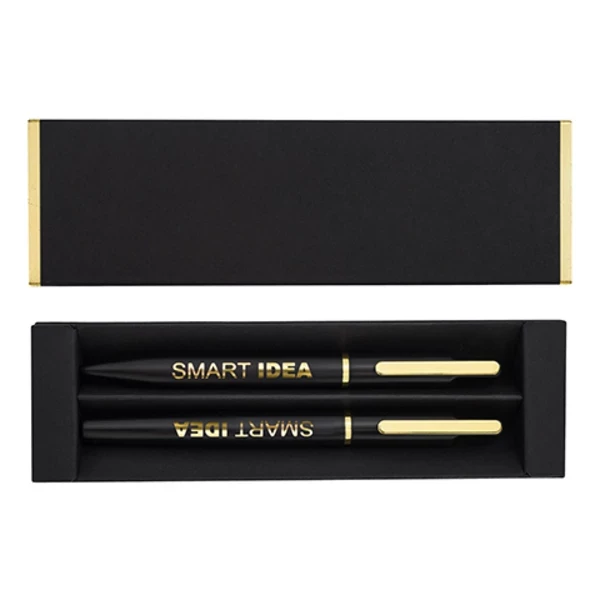 zestaw upominkowy składający się z metalowego długopisu i pióra kulkowego. Możliwość wygrawerowania błyszczącego logo, pasującego kolorem do metalowych detali długopisu